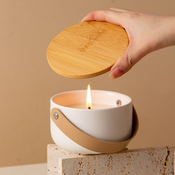 हस्तनिर्मित सफेद सिरेमिक खाली मोमबत्ती पोत ढक्कन और लक्जरी चमड़े के बेल्ट हैंडल के साथ मोमबत्ती जार